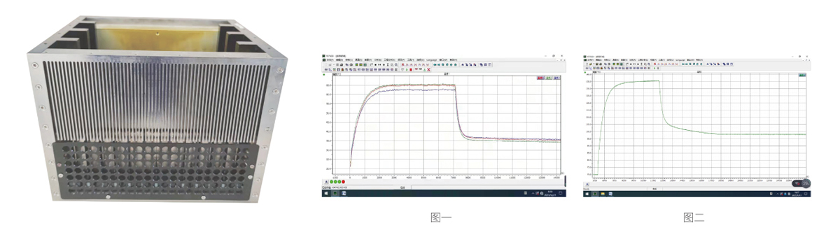 圖二: 環(huán)境溫度70℃,機(jī)箱內(nèi)部器件發(fā)熱功率70W滿功率運(yùn)行,器件溫度升至136℃,打開壓電平面風(fēng)扇( 型號(hào)為YDFS-J12Z10 ),器件溫度降至97℃。